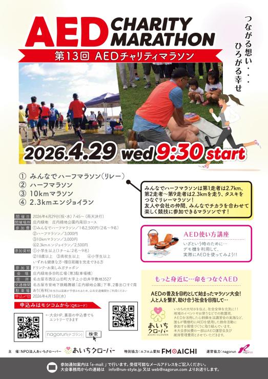 2026年4月29日(祝・水)、庄内緑地にて開催。AEDの普及と命の大切さを伝えるチャリティマラソン。リレー・ハーフ・10km、2.3kmの種目に加え、AED講習会も実施。