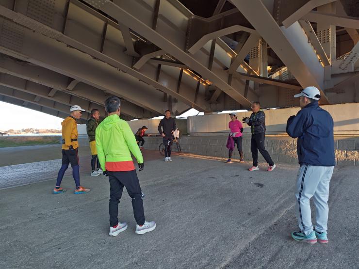 「ランハート」のランニング部と一緒に準備運動を行い、柏市側の遊歩道をフィッシングセンターに向かいます。